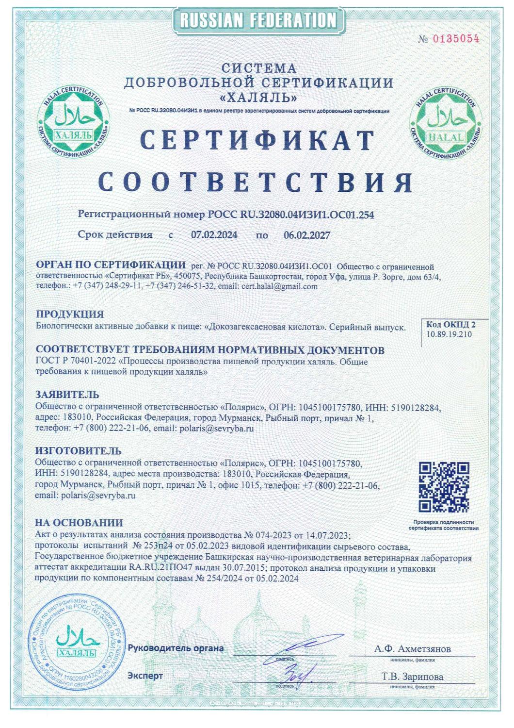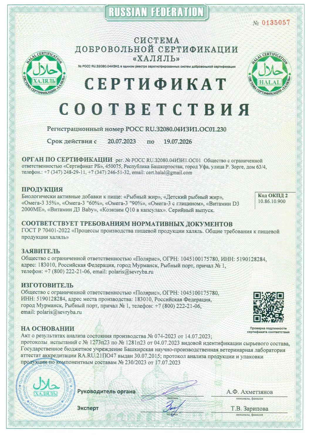 В 2011 году компания «Полярис» подтвердила соответствие продукции высоким требованиям стандарта Халяль. На сегодняшний день «Полярис» - единственный в России производитель капсулированных рыбных жиров, Омега-3 и Коэнзима Q 10 по стандарту Халяль.