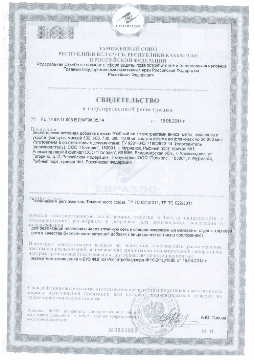 Биологически активная добавка к пище «Рыбный жир с экстрактами аниса, мяты, эвкалипта и укропа»