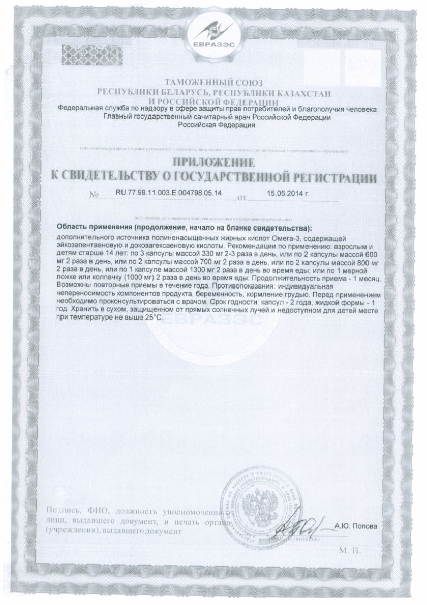 Область применения: рекомендуется в качестве дополнительного источника полиненасыщенных жирных кислот Омега-3, содержащей эйкозапентаеновую и докозагексаеновую кислоты.