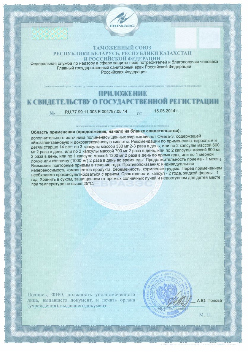 Область применения: рекомендуется в качестве дополнительного источника полиненасыщенных жирных кислот Омега-3, содержащей эйкозапентаеновую и докозагексаеновую кислоты.