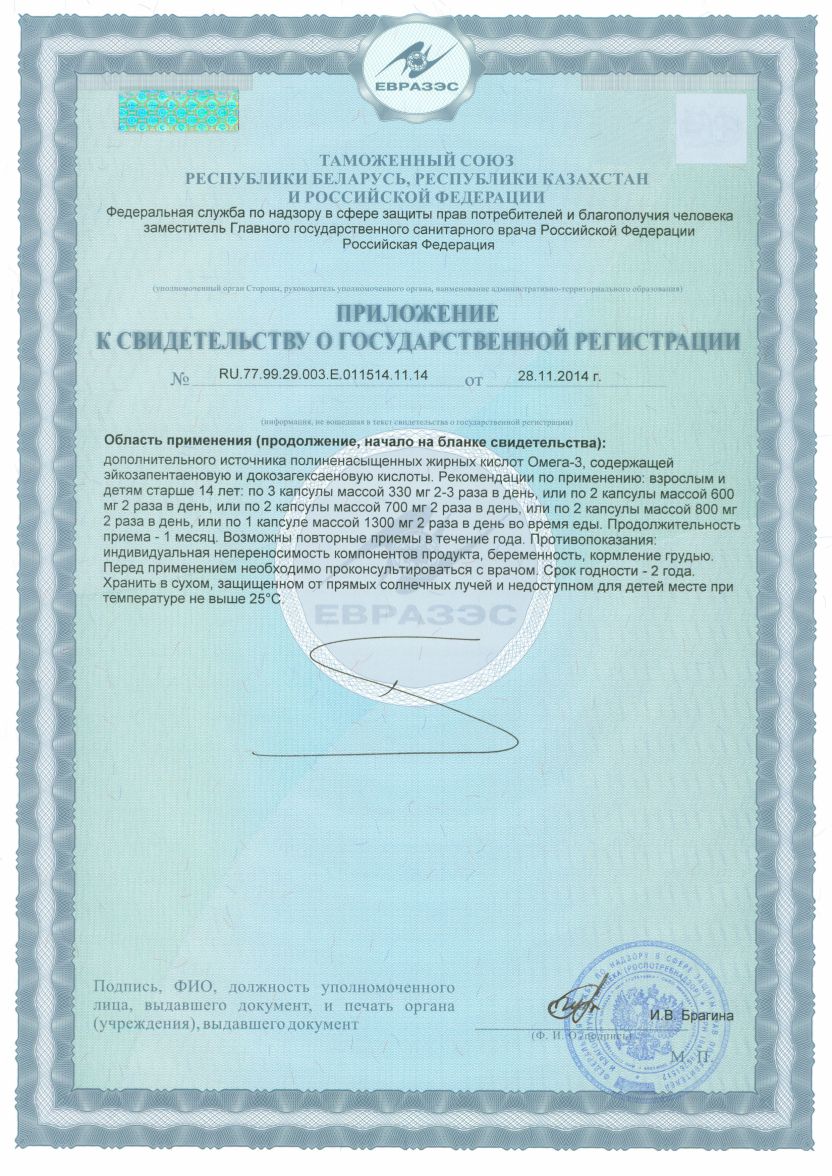 Область применения: рекомендуется в качестве биологически активной добавки к пище, дополнительного источника полиненасыщенных жирных кислот Омега-3, содержащей эйкозапентаеновую и докозагексаеновую кислоты.