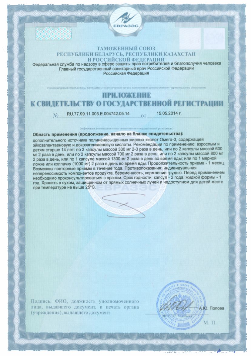 Область применения: рекомендуется в качестве дополнительного источника полиненасыщенных жирных кислот Омега-3, содержащей эйкозапентаеновую и докозагексаеновую кислоты.