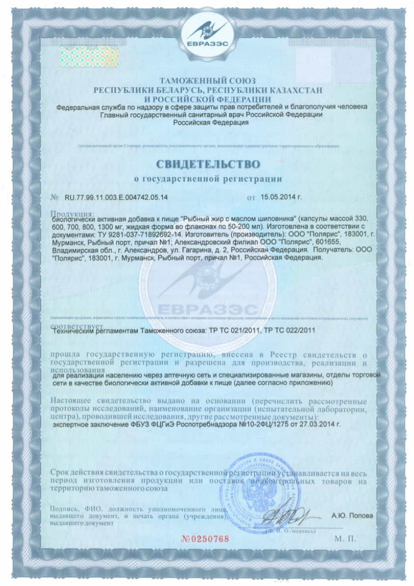Состав: жир океанических рыб, оболочка (желатин, глицерин (пластификатор), вода), масло шиповника, смесь токоферолов (антиокислитель).
