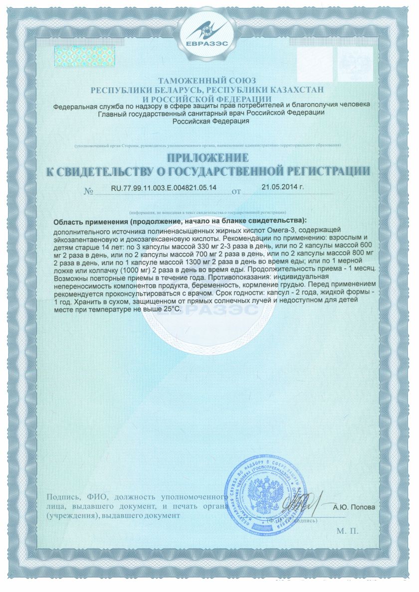 Область применения: рекомендуется в качестве дополнительного источника полиненасыщенных жирных кислот Омега-3, содержащей эйкозапентаеновую и докозагексаеновую кислоты.