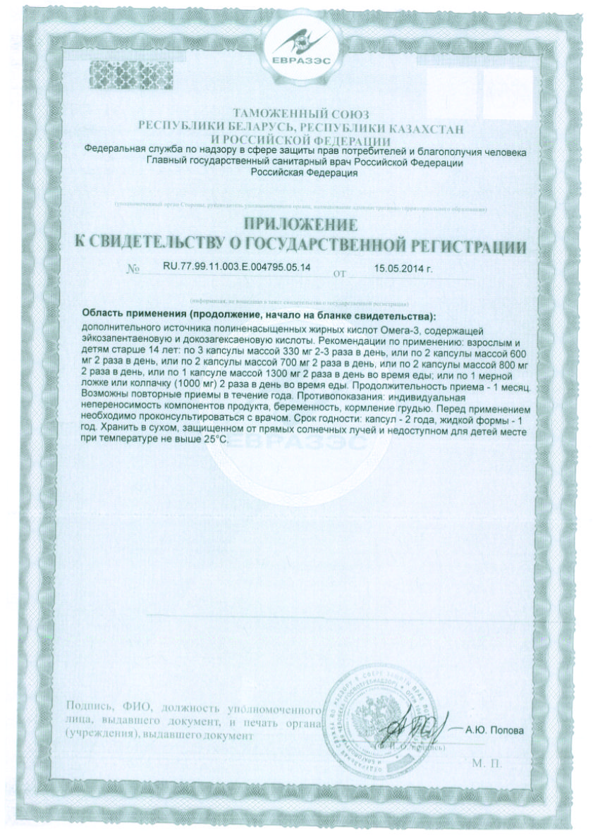 Область применения: рекомендуется в качестве дополнительного источника полиненасыщенных жирных кислот Омега-3, содержащей эйкозапентаеновую и докозагексаеновую кислоты.